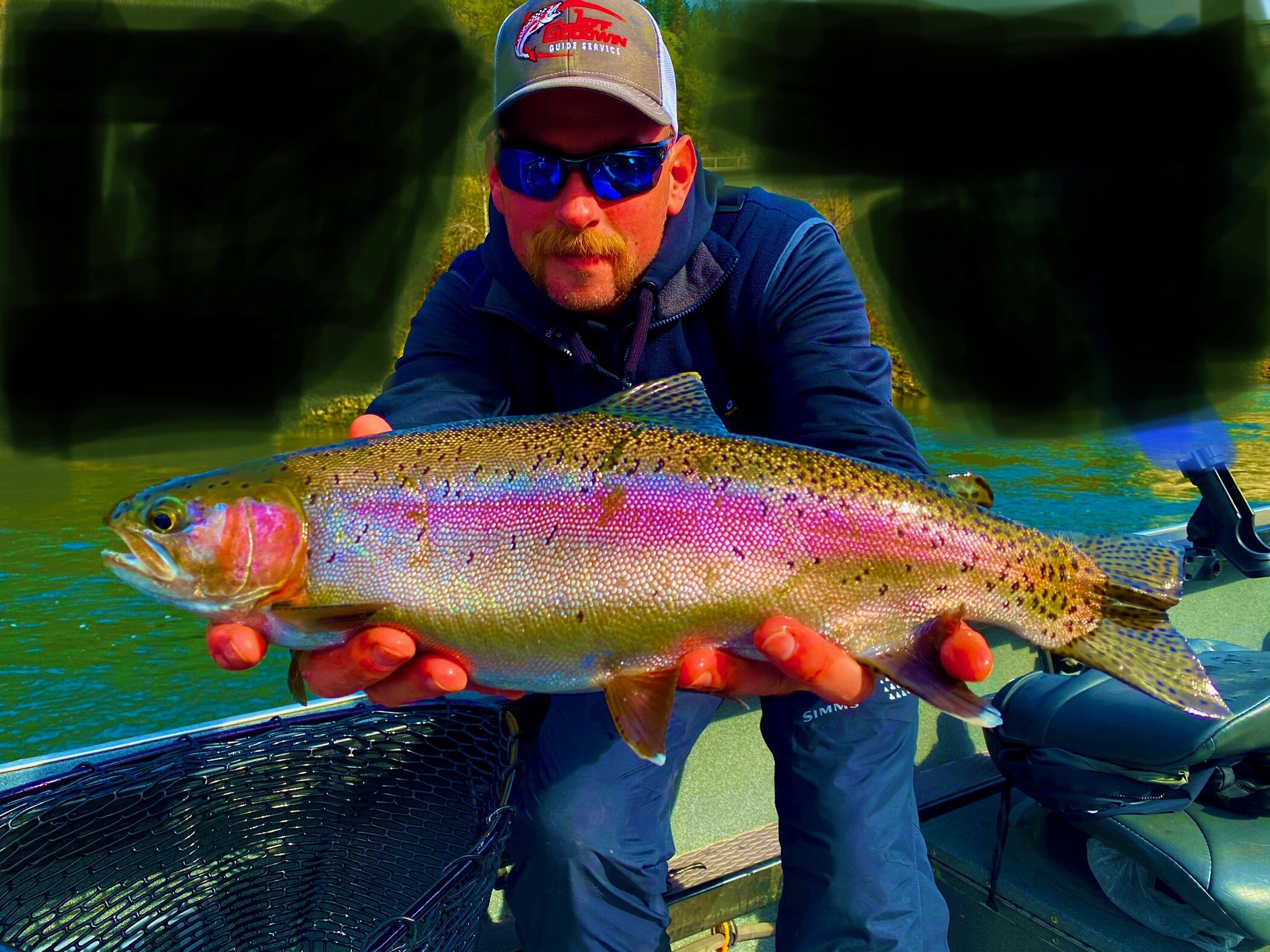 SACRAMENTO RIVER FISHING REPORT: Northern California Trout /Steelhead fishing has been producing some great days of fishing in the Redding CA area. The lower Sac river has a strong population of big bodied Wild Rainbow Trout. You will be hard pressed to find a river that can compete with the Lower Sac River. The angling pressure remains low in most sections of the sac river. What makes the Sacramento River the best year around trout stream?? The creation of the Shasta Dam/ Keswick Dam just below Shasta Dam. These dams were built in the 1940s. the Bureau of Reclamation precisely controls the water temperature of the outflow. The TCD pulls water from different depths of Shasta lake in order to ensure optimum temperatures for spawning Chinook Salmon and there offspring. They keep the temperature coming out of Shasta dam at a chilly 51 to 55 degrees. The Sacramento River is the only river with four distinct runs of Chinook Salmon/Fall, late Fall, Winter run, and the Spring run king Salmon. The winter run king Salmon was nearly extinct before the completion of TCD, THE WINTER RUN KING SALMON ON THE SACRAMENTO RIVER reached as low as 186 returning in 1994. In 2003 there were more then 9,000 Winter run King Salmon returning. The cold water from the TCD improved the Salmon returns and defiantly made the Sacramento River aquatic insect hatches improve in a big way. This is what making this such a great Trout/king Salmon fishery. Spring time is my favorite time to fish for Wild Rainbow Trout. We are seeing 25 to 30 fish days on every outing. We get some real big bows that you don’t see much until this time of year on the SAC RIVER.
