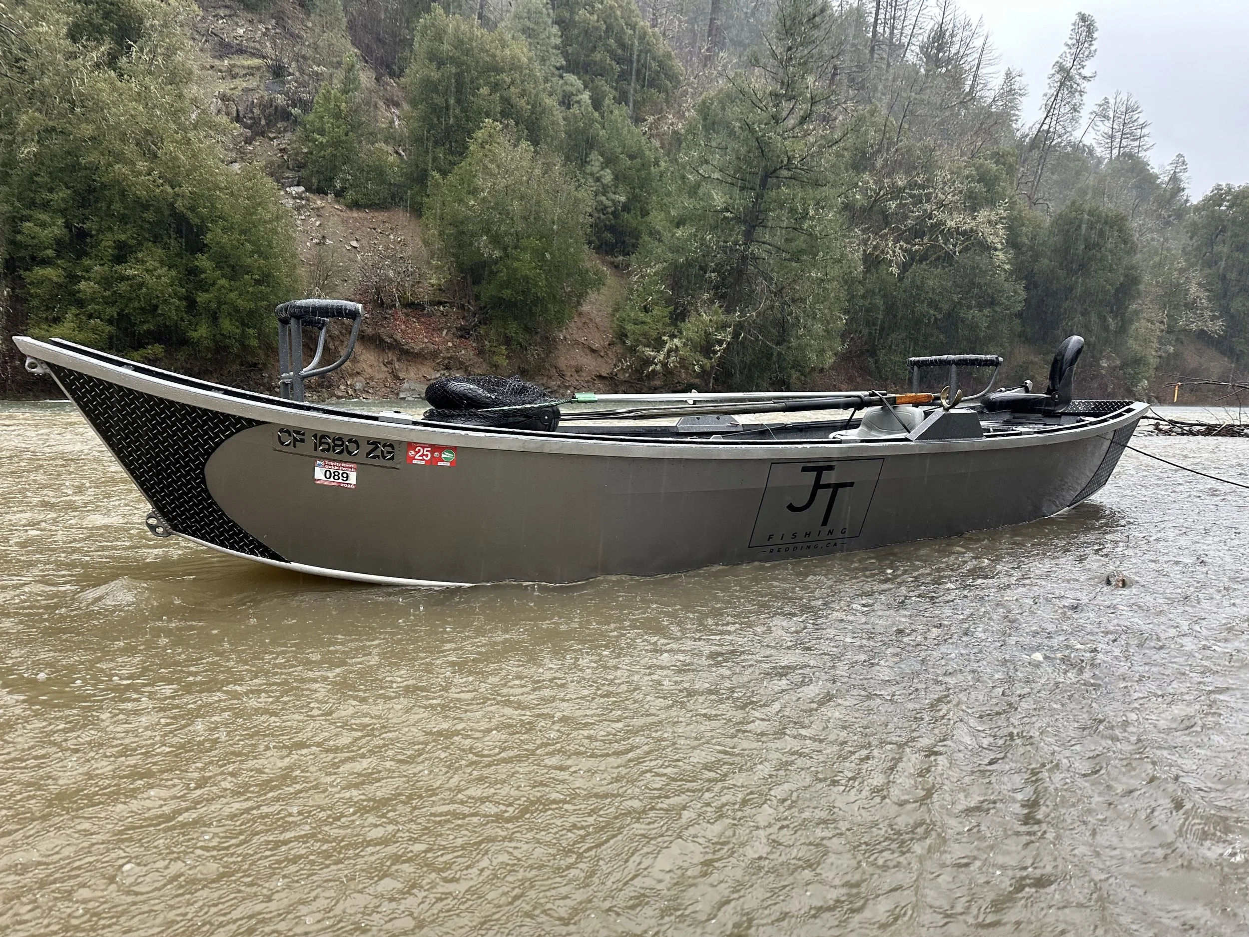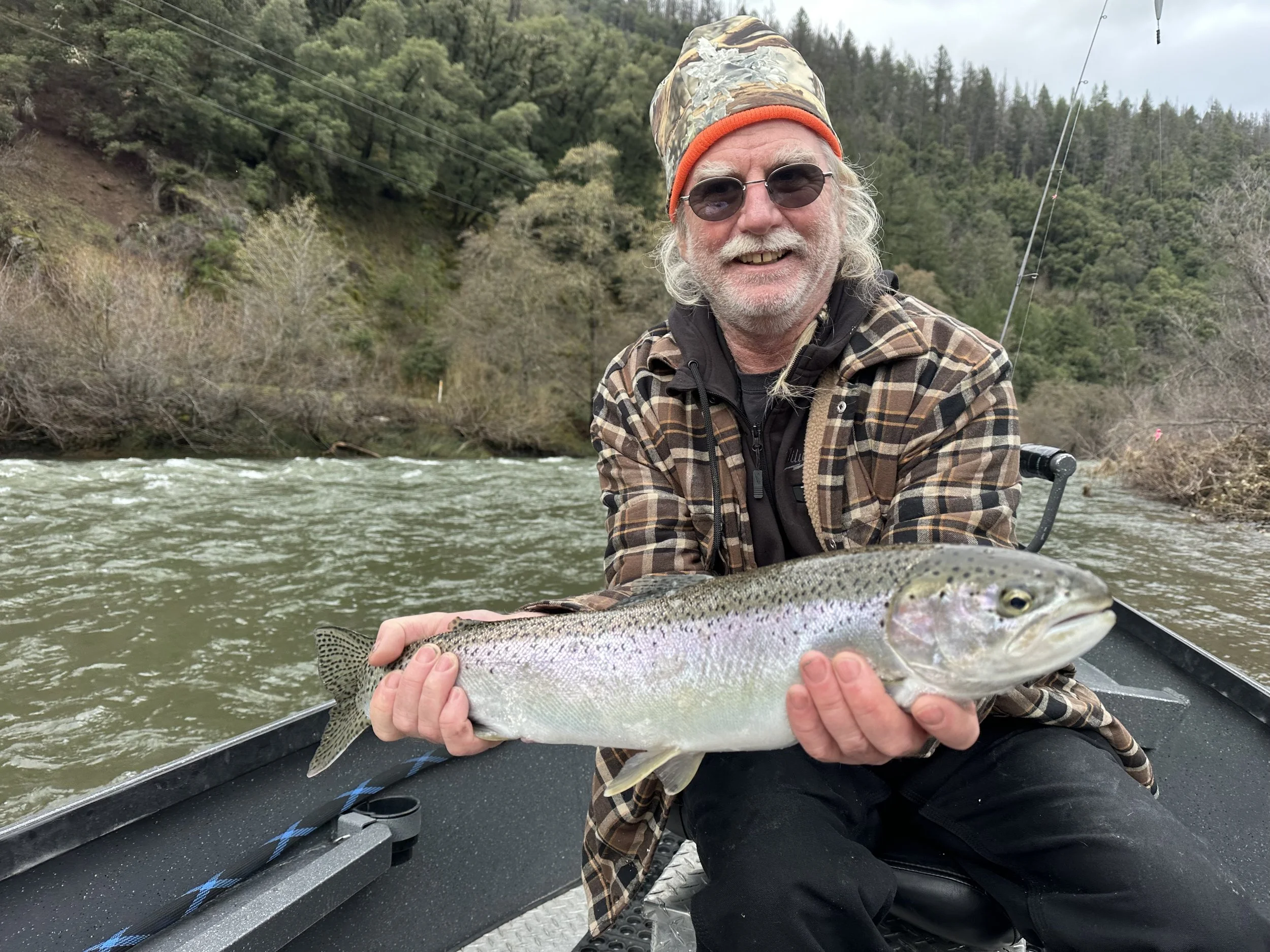 excellent steelhead action on the Trinity River, with the water slightly stained/green from winter rains β generally good for steelhead fishing.
